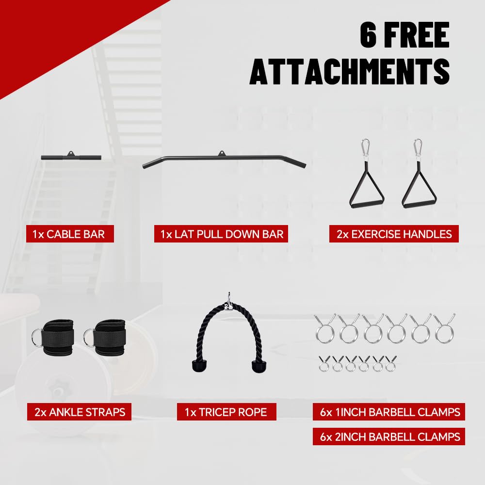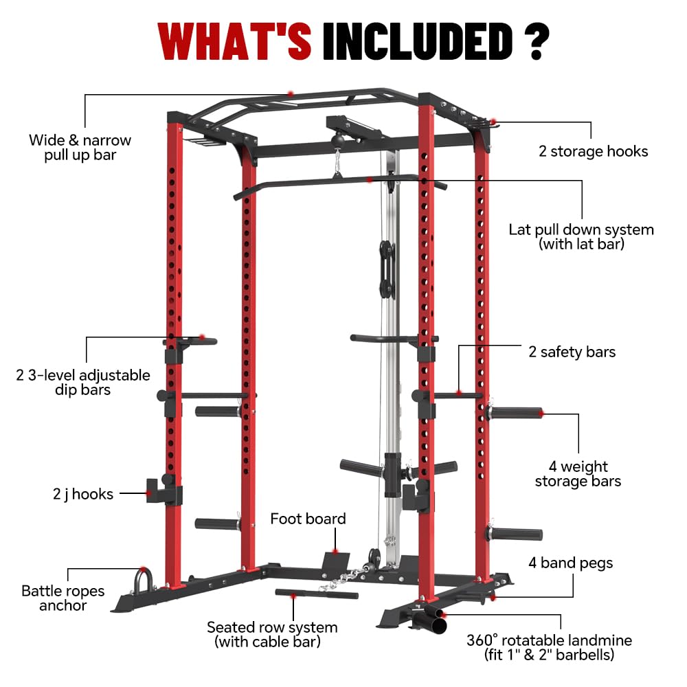 【MULTIPLE TRAINING ACCESSORIES】: This multifunctional power cage comes with full body training attachments, including 1x tricep rope, 1x ankle strap, 2x cable handles, 1x T-bar, 1x lat pull-down bar, 2x dip bars, 2x J-hooks, 2x safety bars, 2x storage hooks, 1x battle rope ring, 6x weight holders with clamps, 1x 360 degree landmine, 1x pulley system and 4x band pegs. No need to buy the extra accessories and you can perform various strength training workouts with just one device.