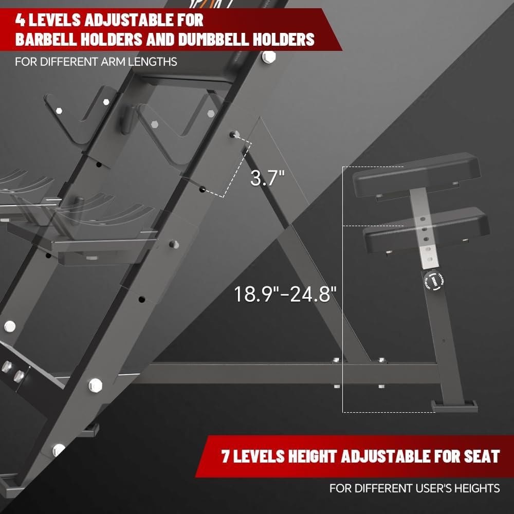 đȘăHEIGHT ADJUSTABLEă: The seat pad of this bicep curl machine is 7 levels height adjustable (25-inches at its highest, 19-inches at its lowest), which make sure the applicability of users with different heights. The barbell holder and dumbbell holder are 4 levels adjustable(3.7" for each level), making the machine fit users with different arm lengths. In this way, the machine will fit all size users.